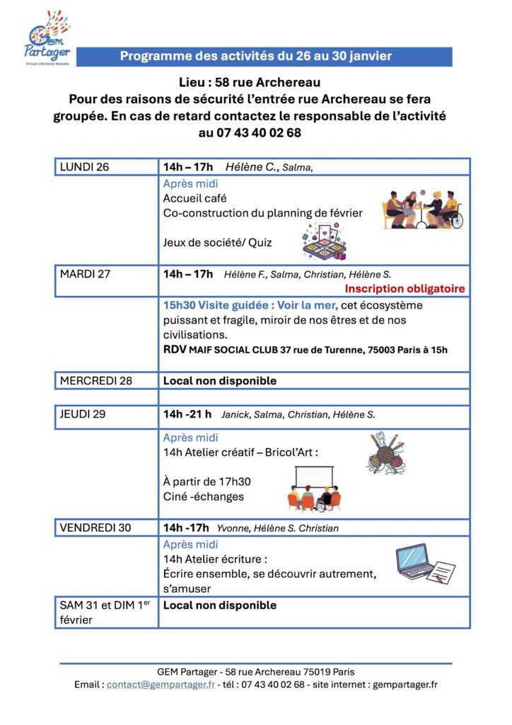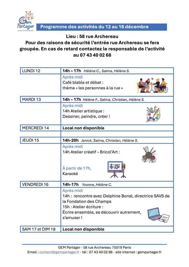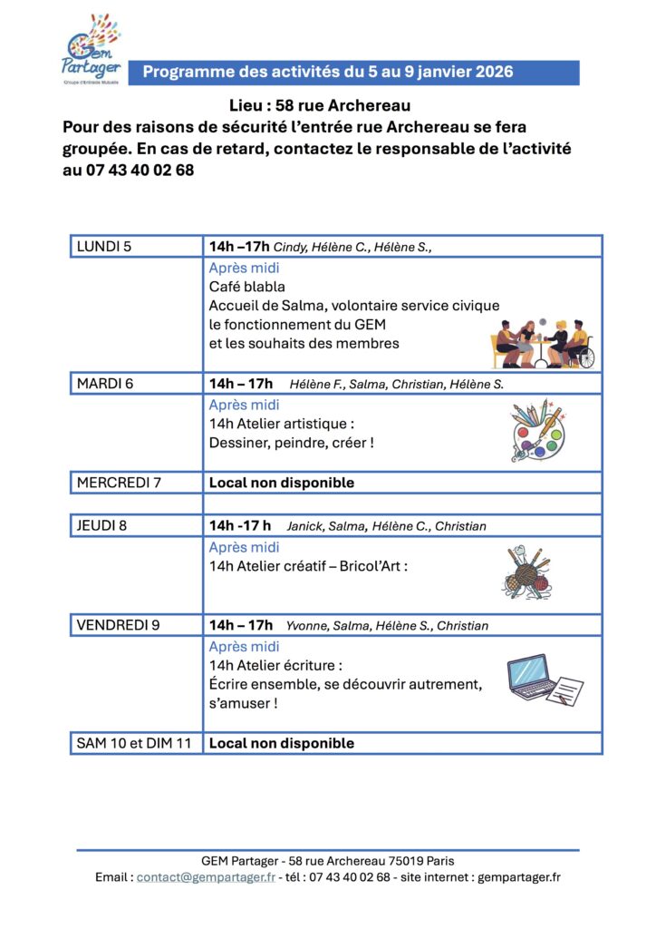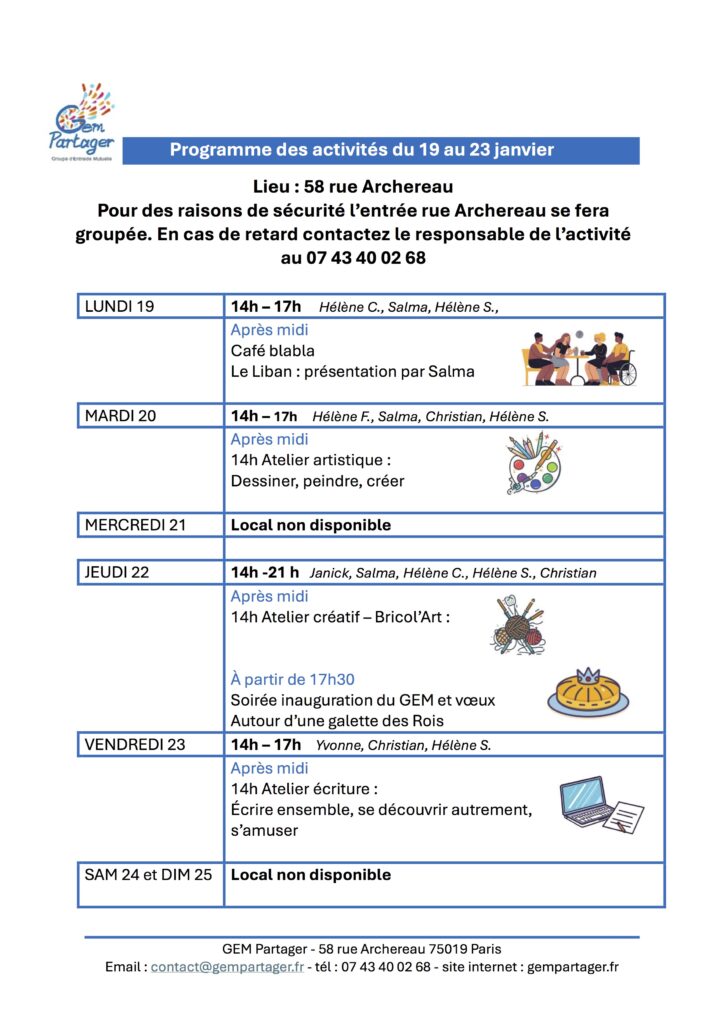 Pour participer à une ou plusieurs de ces activités, inscrivez-vous au 07 43 40 02 68 (SMS ou appel) ou par mail : contact@gempartager.fr